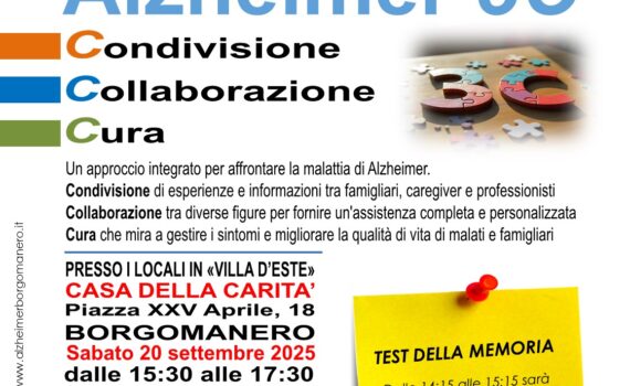 In occasione della32a Giornata Mondiale Alzheimer Sabato 20 settembre 2025 dalle ore 17.30 alle ore 17.30presso la Casa della Carità piazza XXV aprile, 18 L’Associazione ALZHEIMER Borgomanero OdVorganizza l’incontro: Alzheimer 3CCondivisioneCollaborazioneCura